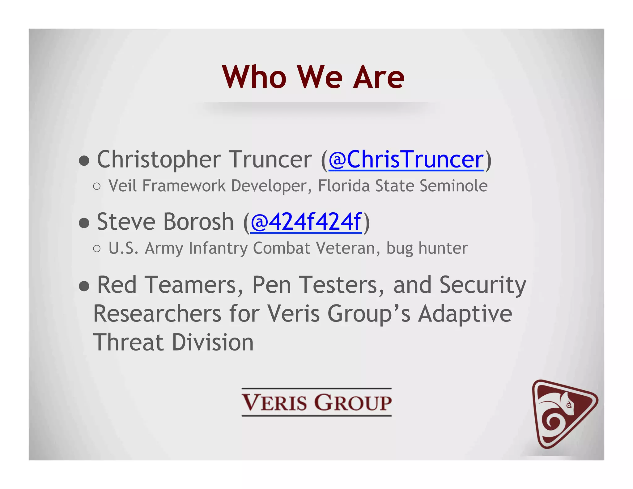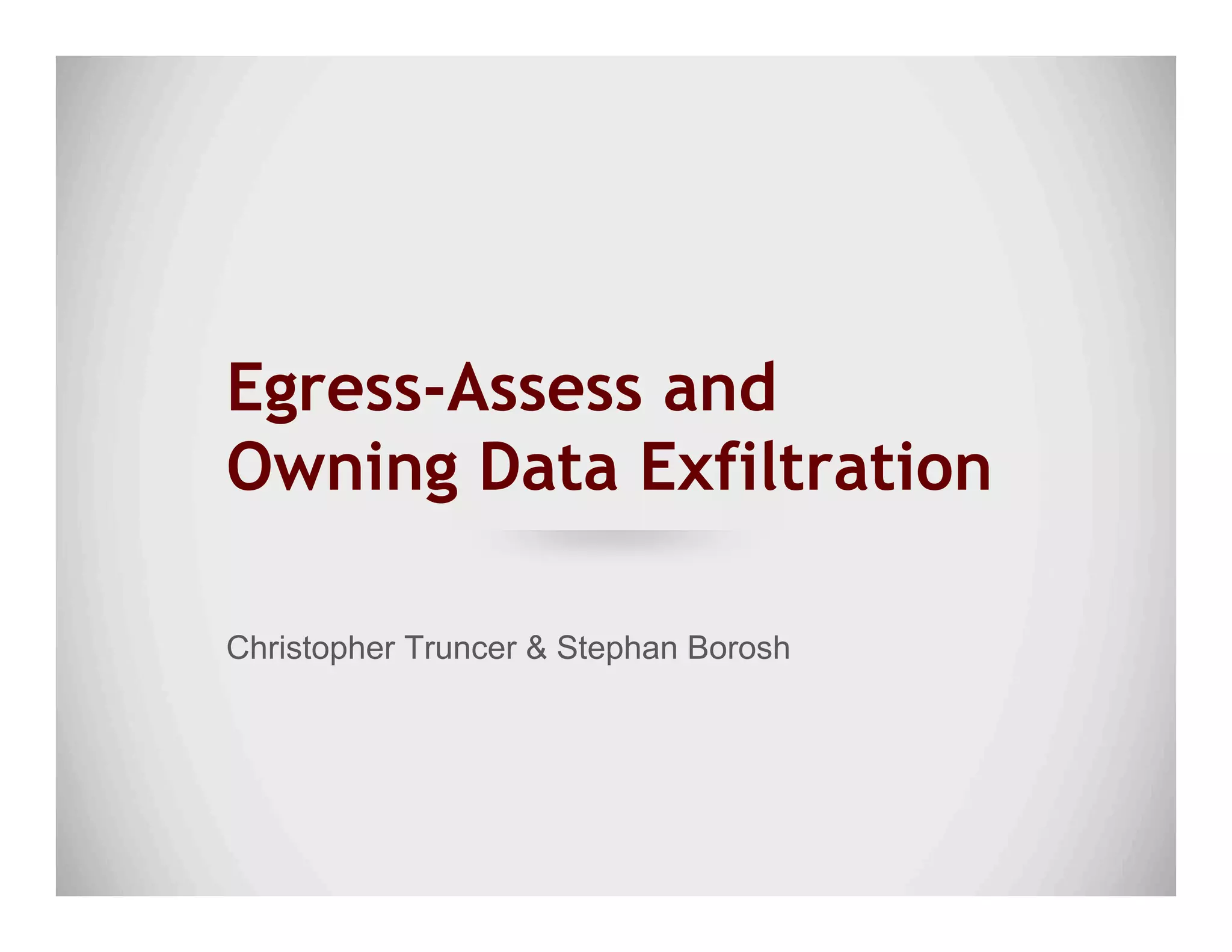 The document discusses data exfiltration techniques and tools developed by Christopher Truncer and Stephan Borosh, focusing on their Egress-Assess framework. It outlines the motivations behind data exfiltration, various tunneling protocols supported, and the project's goals, such as ease of setup and the ability to test blue team detection capabilities. The presentation also includes a discussion on specific case studies, demonstrating various data targets and the importance of simulating real-world attack scenarios to enhance security preparedness.
