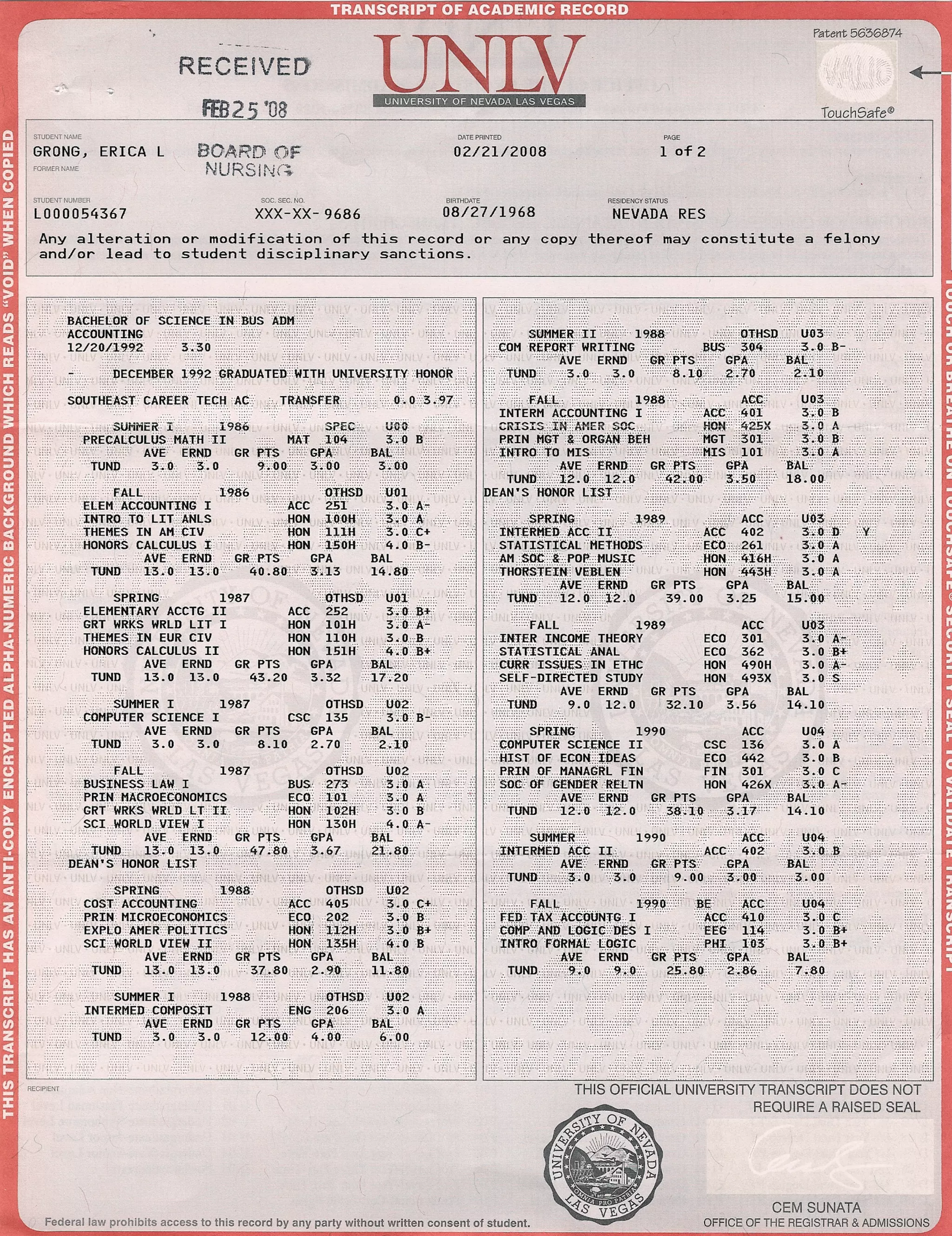Official Transcript of Academic Record