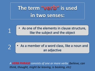This document discusses different verb classes in English grammar. It defines a verb as having two main senses: as a finite verb in clauses like "she calls" and as a nonfinite verb in constructions like "to call". It then explains the different verb forms - the base form, third person -s form, past/-ed form, and -ing participle. These forms serve different functions in finite and nonfinite verb phrases. The document also discusses main modal auxiliaries, marginal modal auxiliaries, modal idioms, catenatives, and semi-auxiliaries. It provides examples and notes about the uses of different types of verbs.