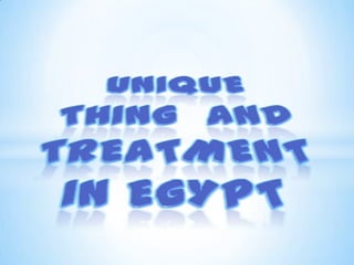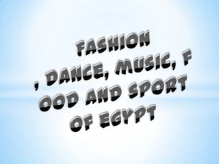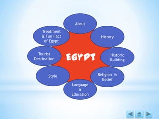 The document provides information about Egypt under various subheadings. It discusses Egypt's history, language, education system, religion and beliefs, architecture, music, cuisine and sports. Some key points include that Egypt has a long history dating back to 3200 BC, Arabic is the official language, education is overseen by both the Ministry of Education and Al-Azhar University, Islam and Christianity are the main religions, and soccer is the most popular sport. The document also highlights several famous landmarks, cities and tourist destinations in Egypt.