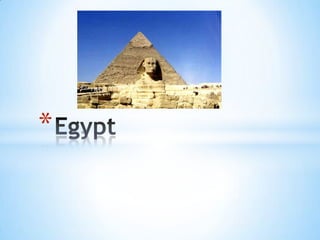 Ancient Egypt developed along the fertile banks of the Nile River around 4,000 BCE. As the climate changed and became hotter and drier, societies were forced to settle along the river, developing irrigation systems and villages. Around 3100 BCE, King Menes unified Upper and Lower Egypt, establishing it as the first centralized state in Africa. Egyptian civilization went on to develop complex social hierarchies, administrative bureaucracies, specialized labor, extensive trade networks, and sophisticated cultural traditions like hieroglyphic writing and monumental architecture and temples. The legacies of ancient Egyptian society continued to influence Nubia and other neighboring cultures for millennia.