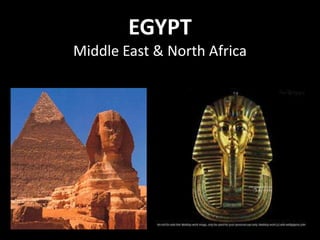 Egypt is located in northeastern Africa, bordered by the Mediterranean Sea, Israel, Sudan, and Libya, with Cairo as its capital city. The official language is Arabic although English is also widely spoken, and Islam is the predominant religion practiced by about 80% of the population. Key features of Egypt's geography include the Nile River, which is the country's most important geographic feature, as well as the Pyramids of Giza and Sphinx located outside Cairo.