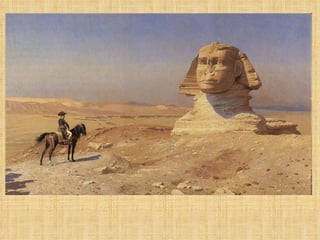 The document discusses several types of Egyptian architecture besides pyramids, including obelisks which were dedicated to the sun god Ra and carved with hieroglyphics, temples which were made of thick brick walls and supported by stone columns in a post-and-lintel style, and the Great Sphinx of Giza which is the largest monolith statue in the world and oldest known monumental sculpture.