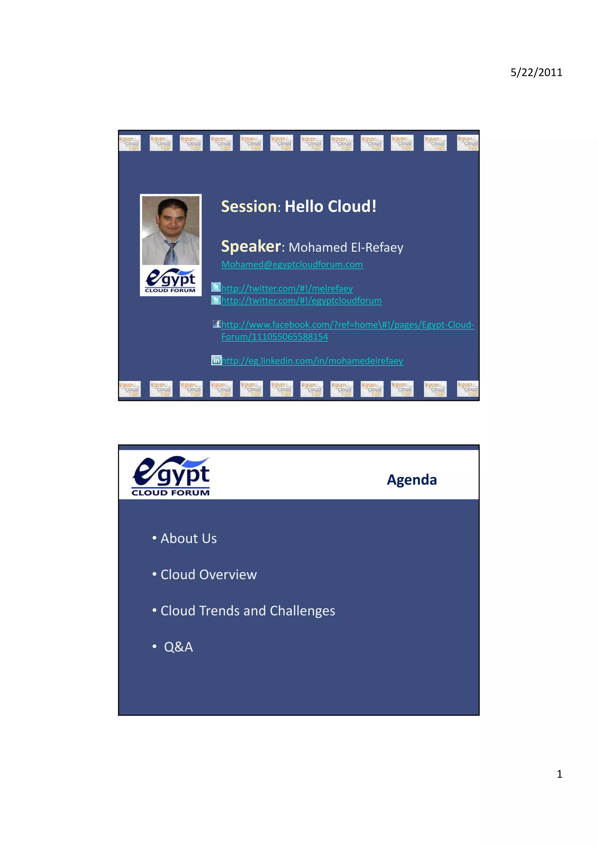 Mohamed El-Refaey presented on cloud computing trends and challenges. He discussed the Egypt Cloud Forum's mission to educate professionals and students on cloud computing. He defined cloud computing, described cloud architecture and service models. He outlined the business benefits of cloud including on-demand access, mobility, flexibility and utility pricing. However, he also noted challenges around security, technology immaturity and vendor lock-in. El-Refaey advised developing a cloud strategy and starting with non-critical applications in a pilot project to address these challenges.