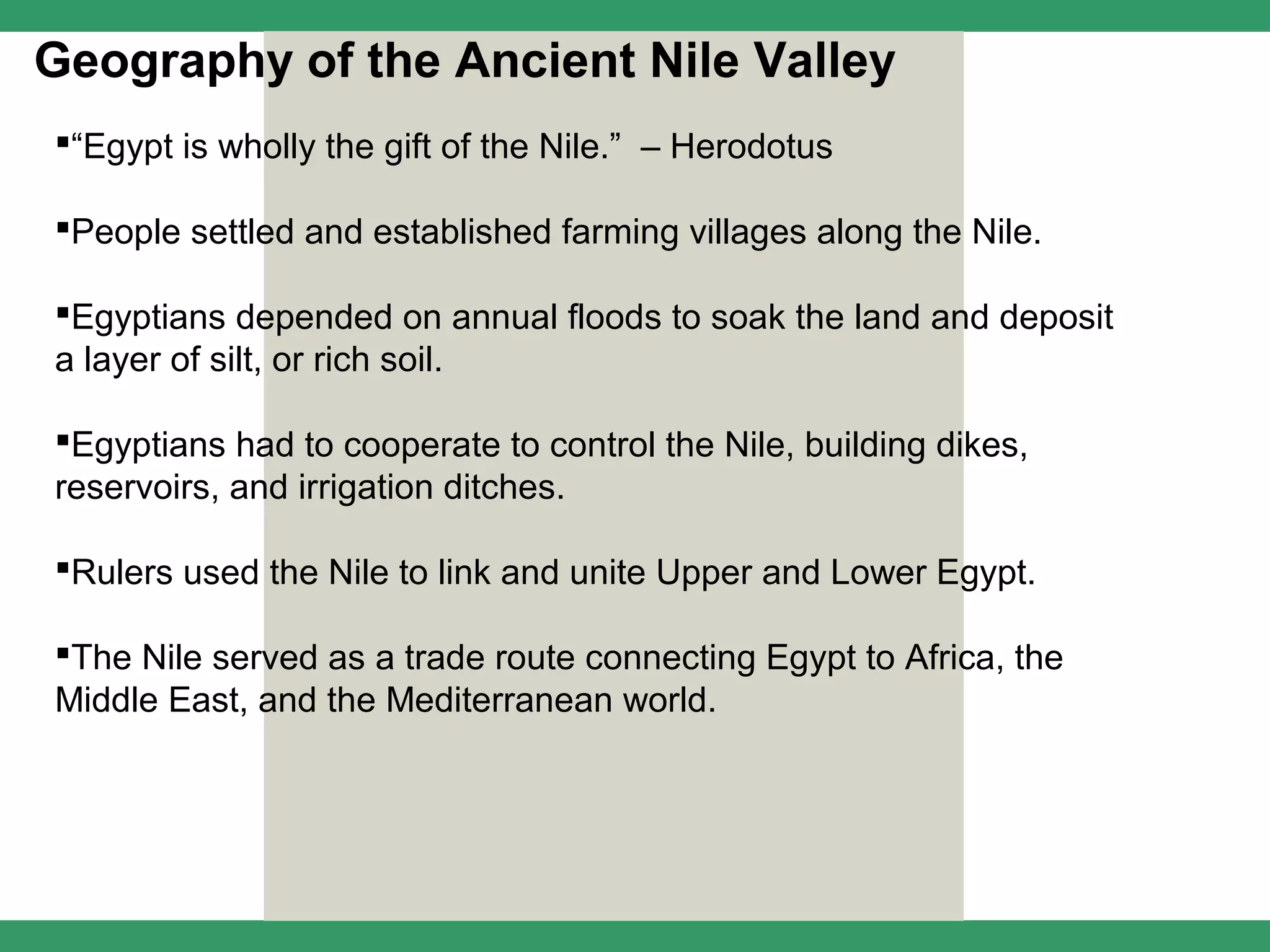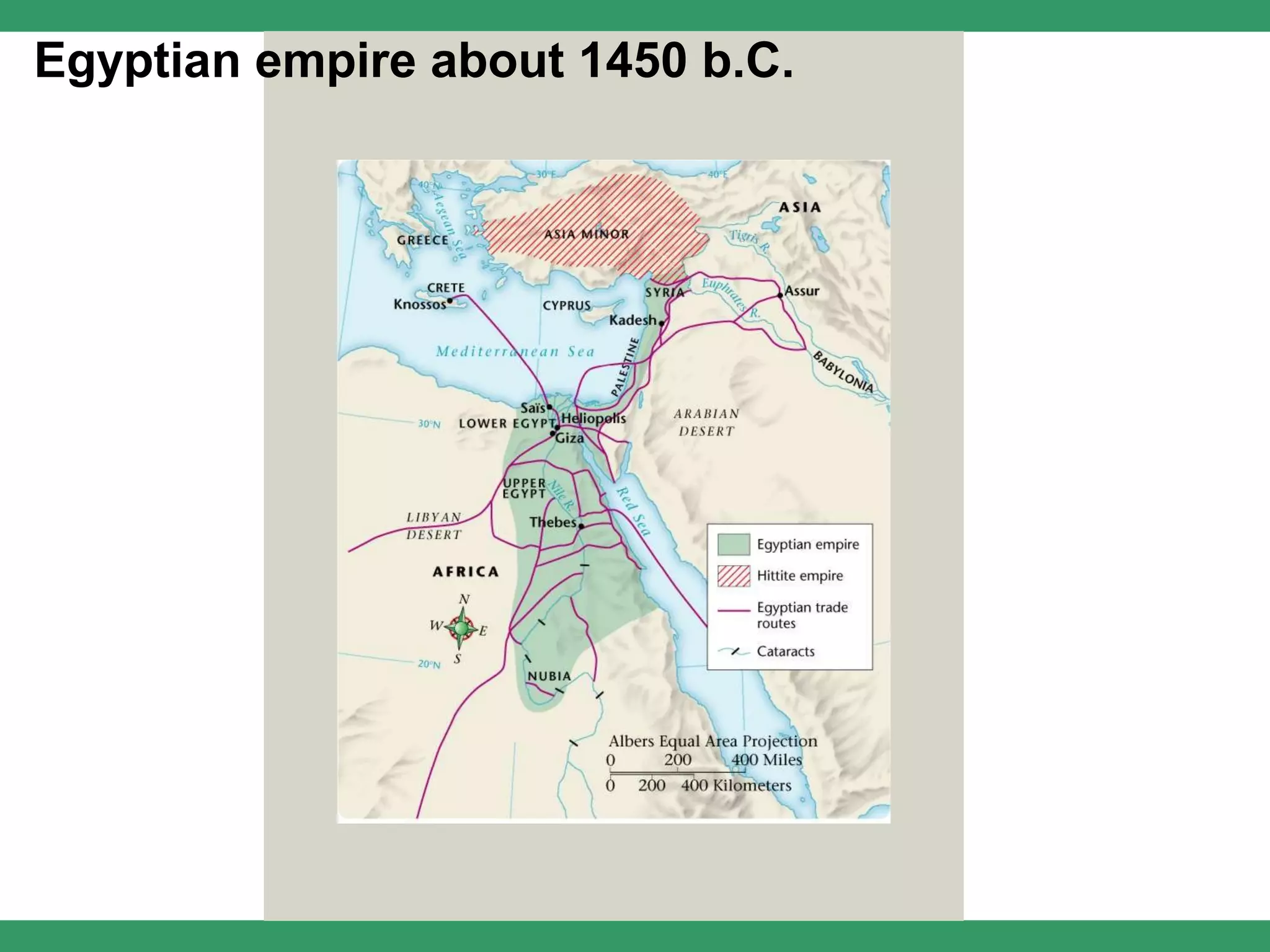 The document provides information on ancient Egyptian civilization between 1450-1100 BC. It describes the geography of Egypt centered around the Nile River, which was essential for agriculture and trade. It then outlines the three main periods of Egyptian rule: the Old, Middle, and New Kingdoms. Key developments included the Old Kingdom organizing a strong central state and building pyramids, the Middle Kingdom experiencing invasions and rebellions, and the New Kingdom expanding Egyptian rule. The document also summarizes Egyptian religious beliefs, architecture, and aspects of daily life like the class system.