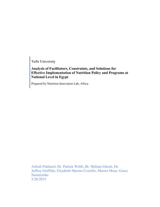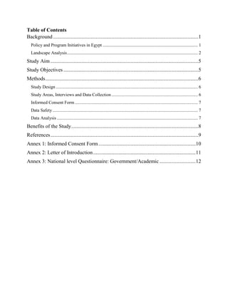 This document provides background information on nutrition policies and programs in Egypt. It summarizes a landscape analysis study conducted in 2012 that examined challenges to implementing nutrition interventions at scale. The study made recommendations to improve coordination between stakeholders. It also discusses Egypt's commitment to the 2014 International Conference on Nutrition, which established global targets to reduce malnutrition. The current study aims to understand facilitators, barriers, and collaboration around translating these policies into actions by interviewing national-level stakeholders. It seeks to examine cross-sectoral coordination and the follow-up on prior recommendations to improve nutrition governance.