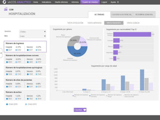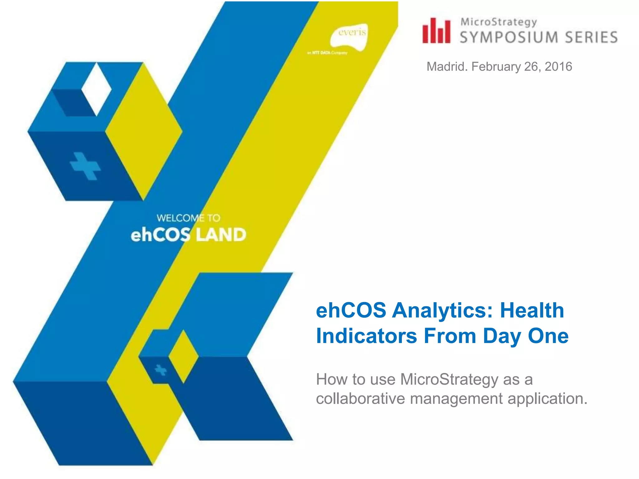 ehCOS Analytics is a solution that enables analysis and mining of healthcare information generated across different IT systems in a hospital. It provides standard dashboards, ad-hoc analysis, and information sharing between users. Key benefits include a single data repository regardless of source, direct access to data without reports, and benchmarking capabilities. Technological challenges included leveraging MicroStrategy's capabilities through a portal layer for enhanced functions while maintaining future compatibility and integration rules. Results demonstrated customizing MicroStrategy through proprietary and partially proprietary dashboards, HTML coding, and event management between dashboards.