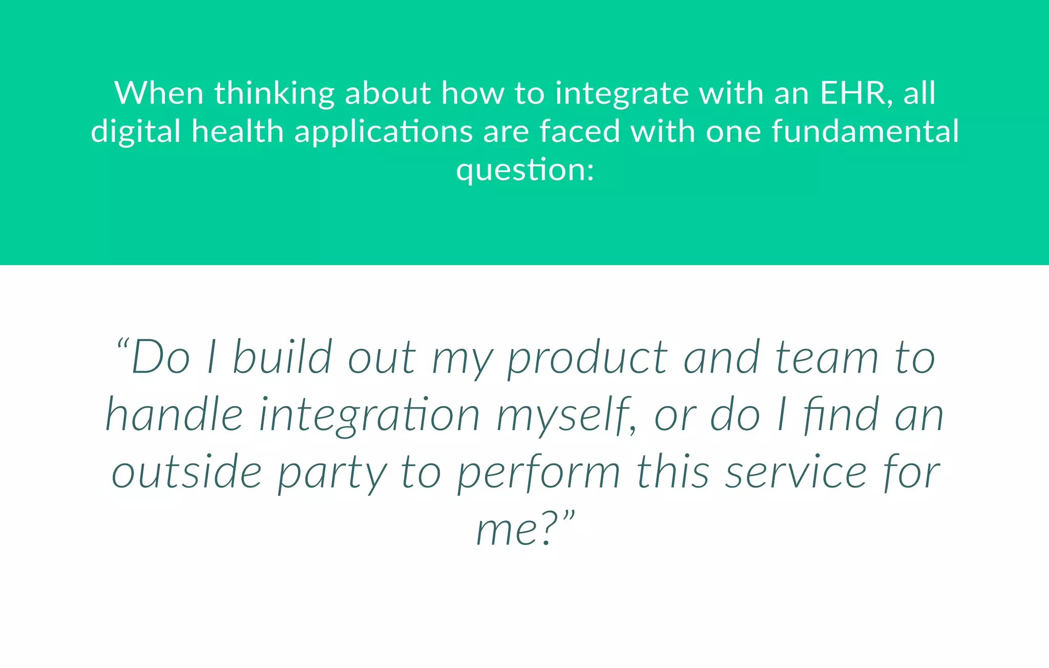 The document discusses the decision-making process for digital health applications regarding EHR integration, highlighting key factors such as up-front costs, speed, expertise, trust, and scalability. It emphasizes the benefits of partnering with Redox for integration, which eliminates the need for in-house development and facilitates quick, efficient connections with various health systems. By collaborating with Redox, companies can focus on their products while gaining access to a network of integrations and experienced industry professionals.
