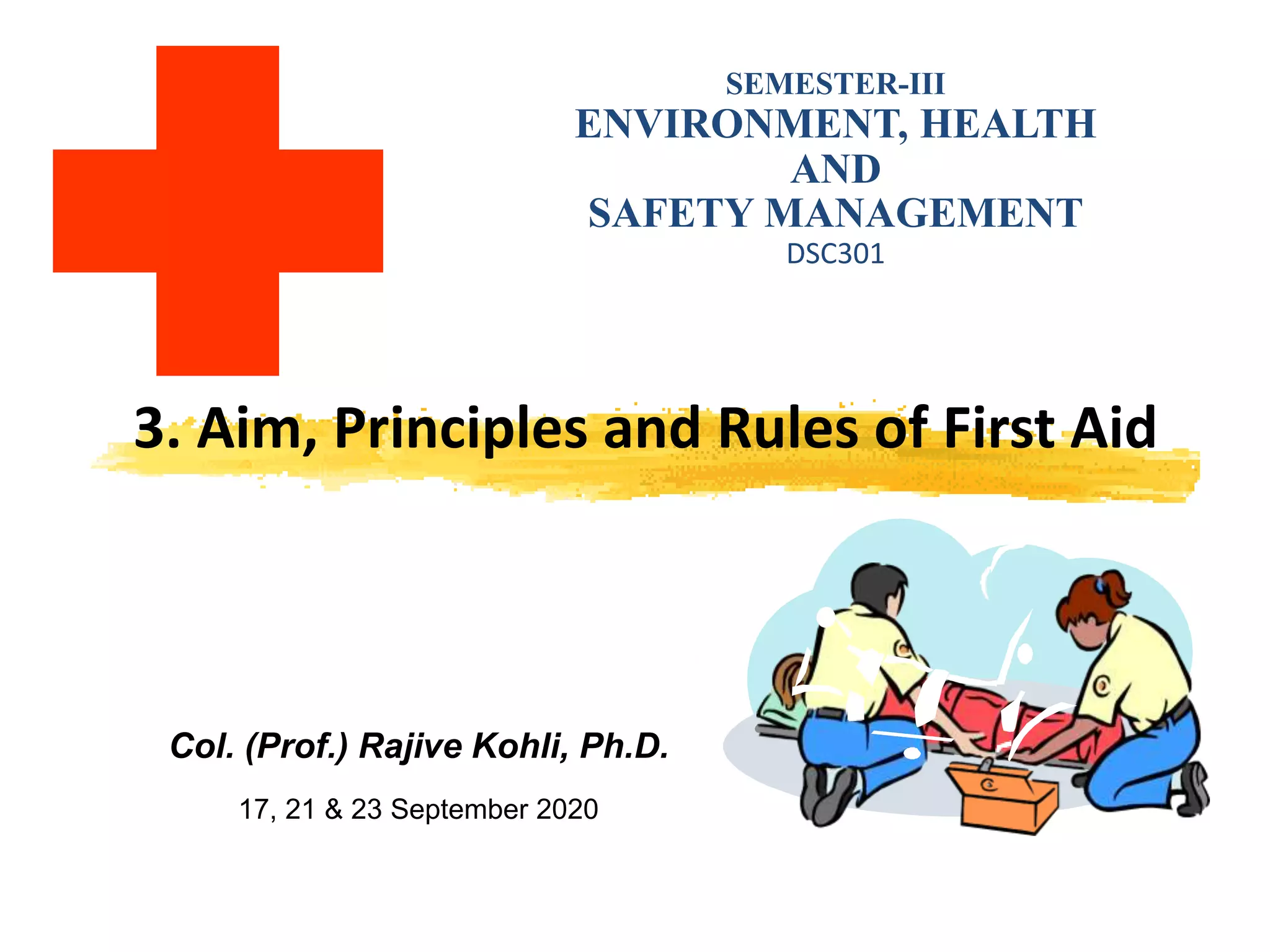 The document outlines the key principles and procedures of first aid. It discusses that first aid involves immediately assisting or treating someone before medical help arrives using available resources to preserve life, prevent worsening of conditions, and promote recovery. The key aims of first aid are to preserve life, prevent injuries from worsening, and promote recovery. It also describes the DRABC action plan that first aiders should follow to assess dangers, check response, open airways, check breathing, and check circulation of a casualty. Protecting oneself from infection as a first aider is also emphasized.