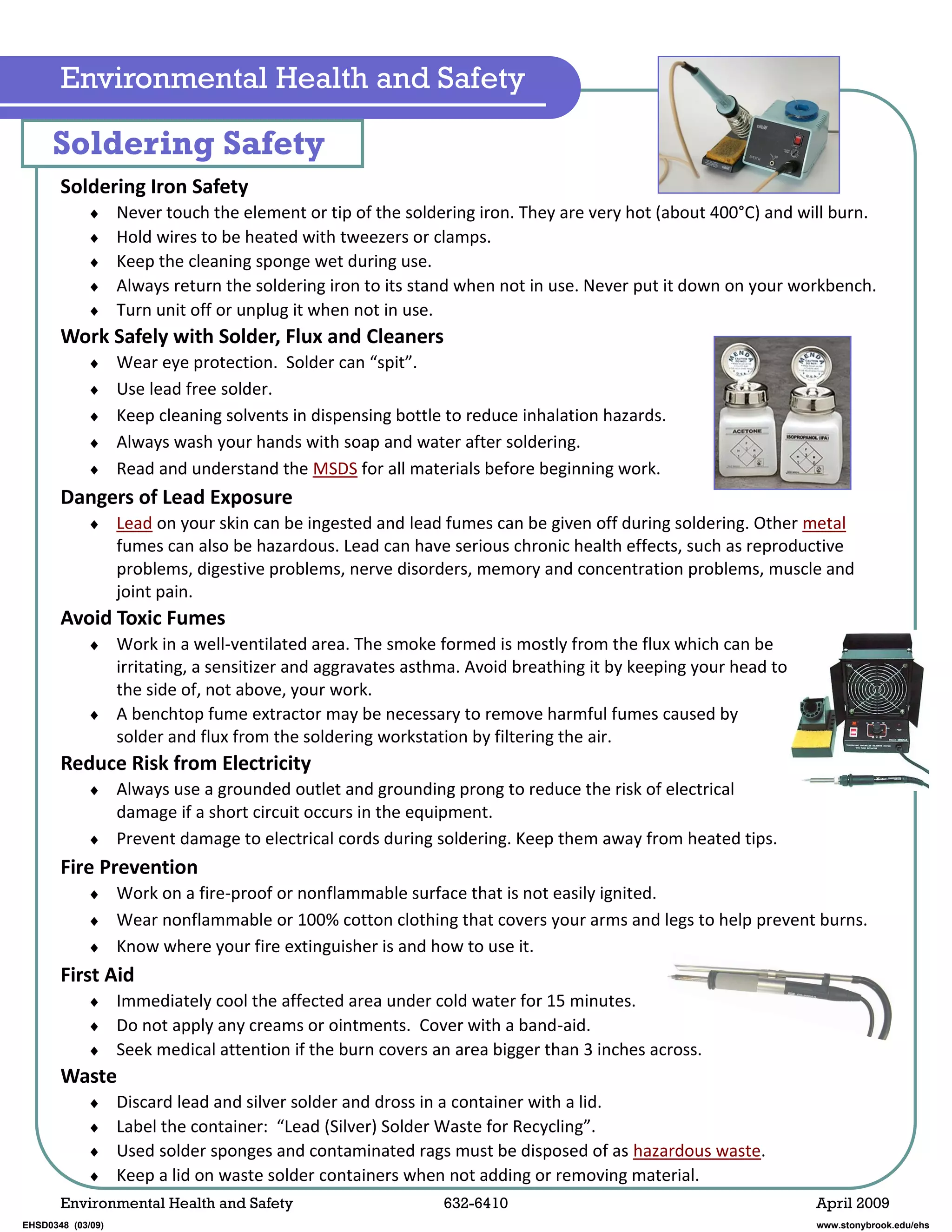 Soldering involves risks of burns, toxic fume inhalation, and electrical hazards that require safety precautions. The document outlines steps to take such as wearing eye protection, working in a ventilated area, using a soldering iron stand, and properly disposing of wastes to reduce risks when soldering. Precautions like avoiding touching hot elements, keeping sponges wet, and turning off equipment when not in use can prevent burns. Proper ventilation, personal protective equipment, and avoiding lead use help limit inhalation of toxic fumes from soldering.