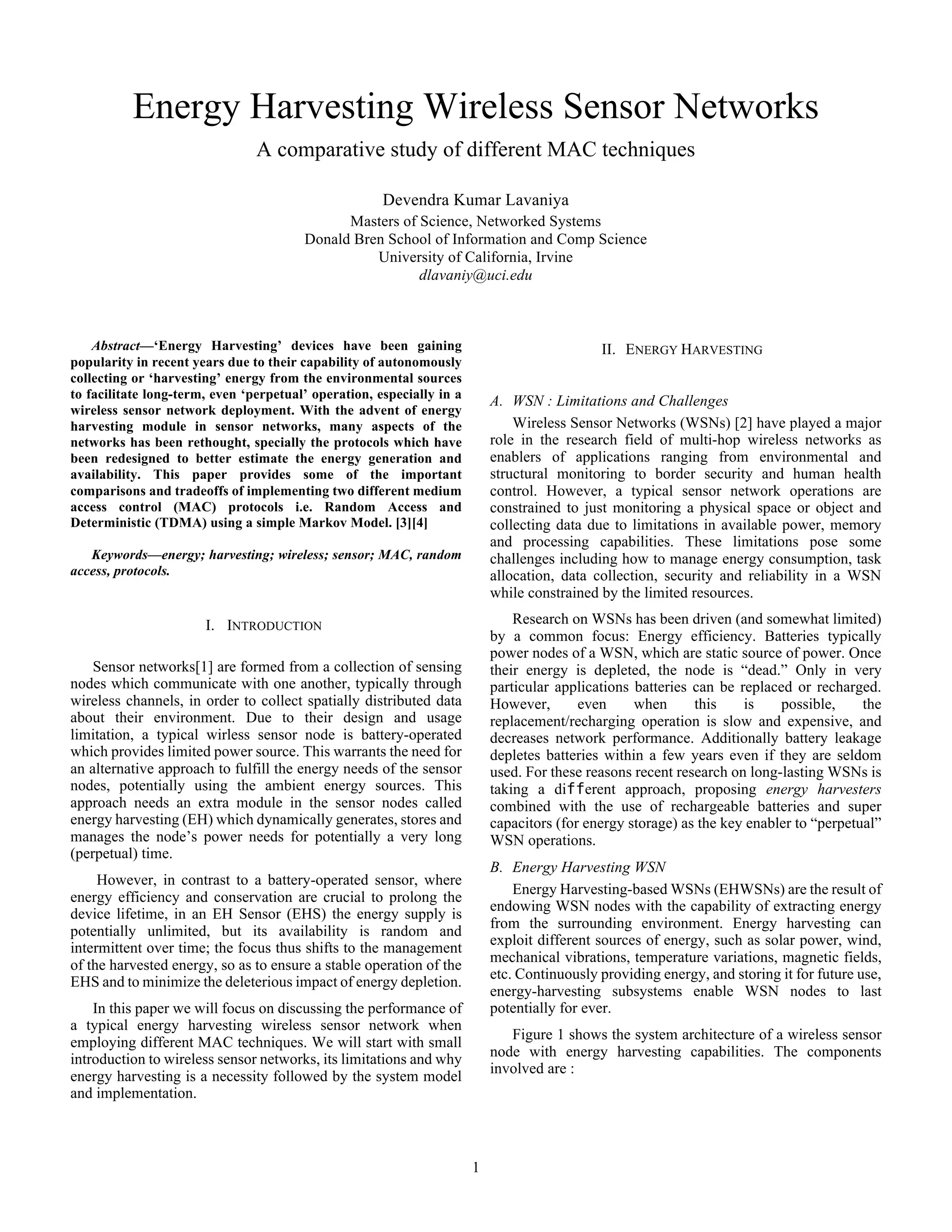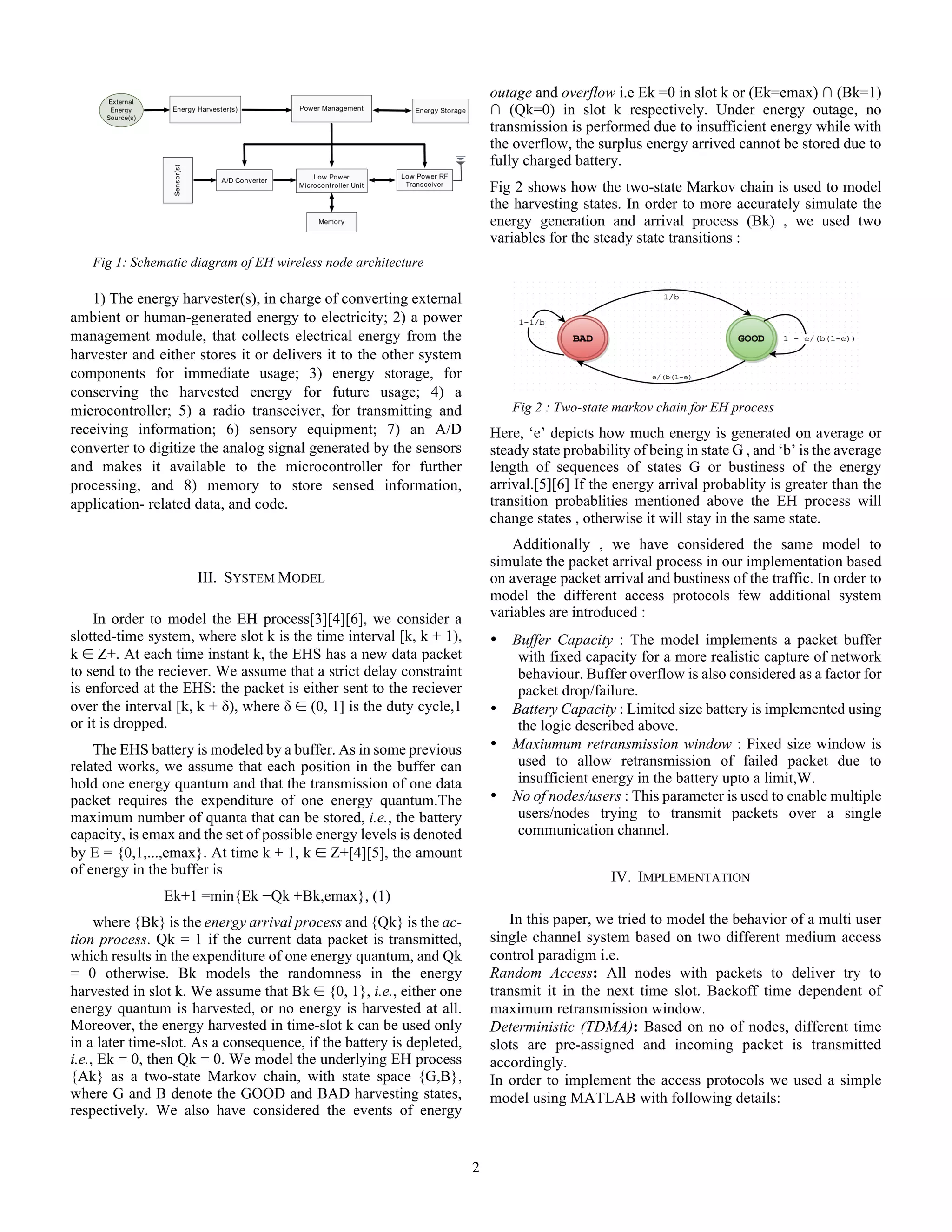 This document provides a summary of a student's master's thesis that compares different medium access control (MAC) techniques for energy harvesting wireless sensor networks. The student models the performance of a sensor network using random access and time-division multiple access (TDMA) MAC protocols. The modeling accounts for factors like the intermittent nature of energy harvesting, limited battery capacity, and packet arrival patterns. The random access protocol allows nodes to transmit randomly, while the TDMA protocol assigns dedicated time slots to nodes. The thesis presents the system models and implementation details of simulating the two MAC protocols using MATLAB.