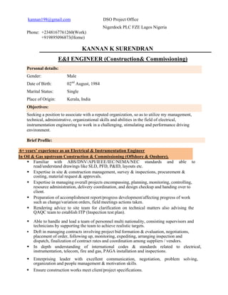 The document is a detailed resume for Kannan K Surendran, an E&I engineer with over 6 years of experience in electrical and instrumentation engineering, specifically in oil and gas upstream construction and commissioning. His professional background includes roles at Hyundai Heavy Industries and various engineering projects for prominent clients like Chevron and ONGC, demonstrating strong skills in site and construction management, teamwork, and compliance with international standards. Kannan is seeking a challenging position to utilize his technical and managerial skills within a reputable organization.