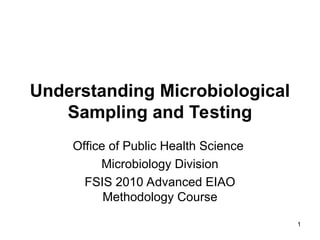 The document outlines the microbiological sampling and testing procedures essential for food safety programs, emphasizing the significance of bacteria testing in preventing foodborne illnesses. It discusses various sampling methods, laboratory testing protocols, and the importance of representative test portions for accurate detection of pathogens like E. coli O157:H7. Additionally, the document highlights challenges in pathogen detection and the need for rigorous validation of testing methods to ensure compliance with FSIS guidelines.