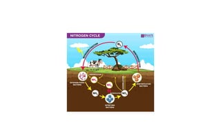 The nitrogen cycle involves the conversion of nitrogen between its various chemical forms as it circulates between the atmosphere, soil, water, and living organisms. It consists of five main processes: nitrogen fixation, nitrification, assimilation, ammonification, and denitrification. Nitrogen fixation converts atmospheric nitrogen into ammonia through lightning or by symbiotic bacteria. Assimilation involves plants and animals incorporating nitrogen compounds into their tissues. Ammonification and denitrification return nitrogen to the soil and atmosphere through decomposition.