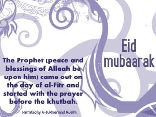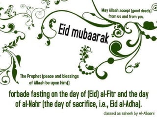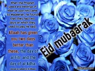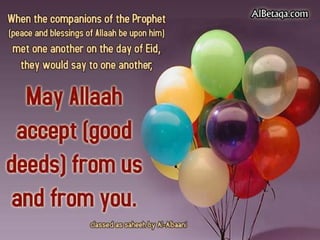The document wishes everyone a happy and peaceful Eid. It hopes that Allah will accept people's good deeds, forgive their transgressions, and ease suffering around the world. Several passages then wish everyone a happy Eid Mubarak and hope that the holiday brings fun, happiness, and endless blessings.