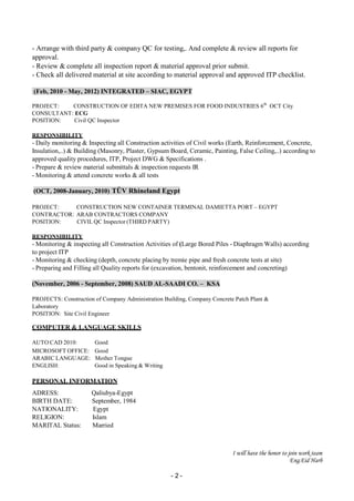 Eid Mamdouh Ismail is an Egyptian civil QC engineer with over 10 years of experience in quality control for large construction projects in Egypt and Saudi Arabia. He has worked on numerous power plant, industrial plant, and infrastructure projects for major contractors. His responsibilities have included inspecting civil works and building construction activities to ensure compliance with quality procedures, plans, and specifications. He is proficient in AutoCAD, Microsoft Office, and speaks Arabic and English.