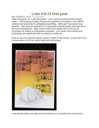 This summarizes the blog posts of Luke Eisenhardt for the class Biotechnology and Art. Over multiple weeks, Luke shared personal details and opinions on topics like powerlifting, alligator meat, animal relations, aging, and Alan Turing. He included original photos and artwork. Luke aimed to challenge conventional views at times, while exploring how biotechnology intersects with his interests in science, art, nutrition, and more. The summary captures the variety of Luke's contributions to discussing these intersecting fields.