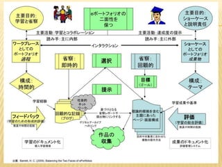 Dr. Helen Barrett gave a keynote address about the challenges and opportunities for change in implementing ePortfolios. She discussed that ePortfolios require complex change that needs a roadmap to assess needs, plan, implement, and evaluate. The roadmap involves preparing stakeholders for change, developing a change strategy, conducting a needs assessment, designing the desired outcome, creating an implementation plan, implementing change, evaluating and course-correcting, and celebrating the new outcome. For successful implementation, the vision and purposes of ePortfolios must be clear, and both skills and incentives for all stakeholders must be addressed. Reflection and relationships should be at the heart of ePortfolios, not just the technology.