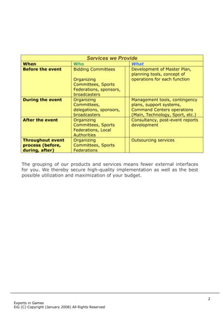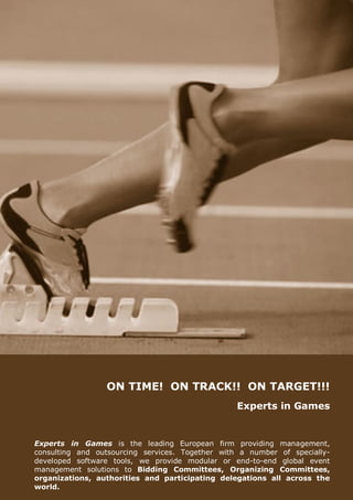 Experts in Games is a leading European consulting firm that provides event management solutions and outsourcing services for global sporting events. They work with bidding and organizing committees, sports federations, and delegations throughout the entire event process, from the bidding stage through post-event. Their services include developing master plans, management tools, and outsourcing support functions. Experts in Games draws on experience from major international sporting events around the world.