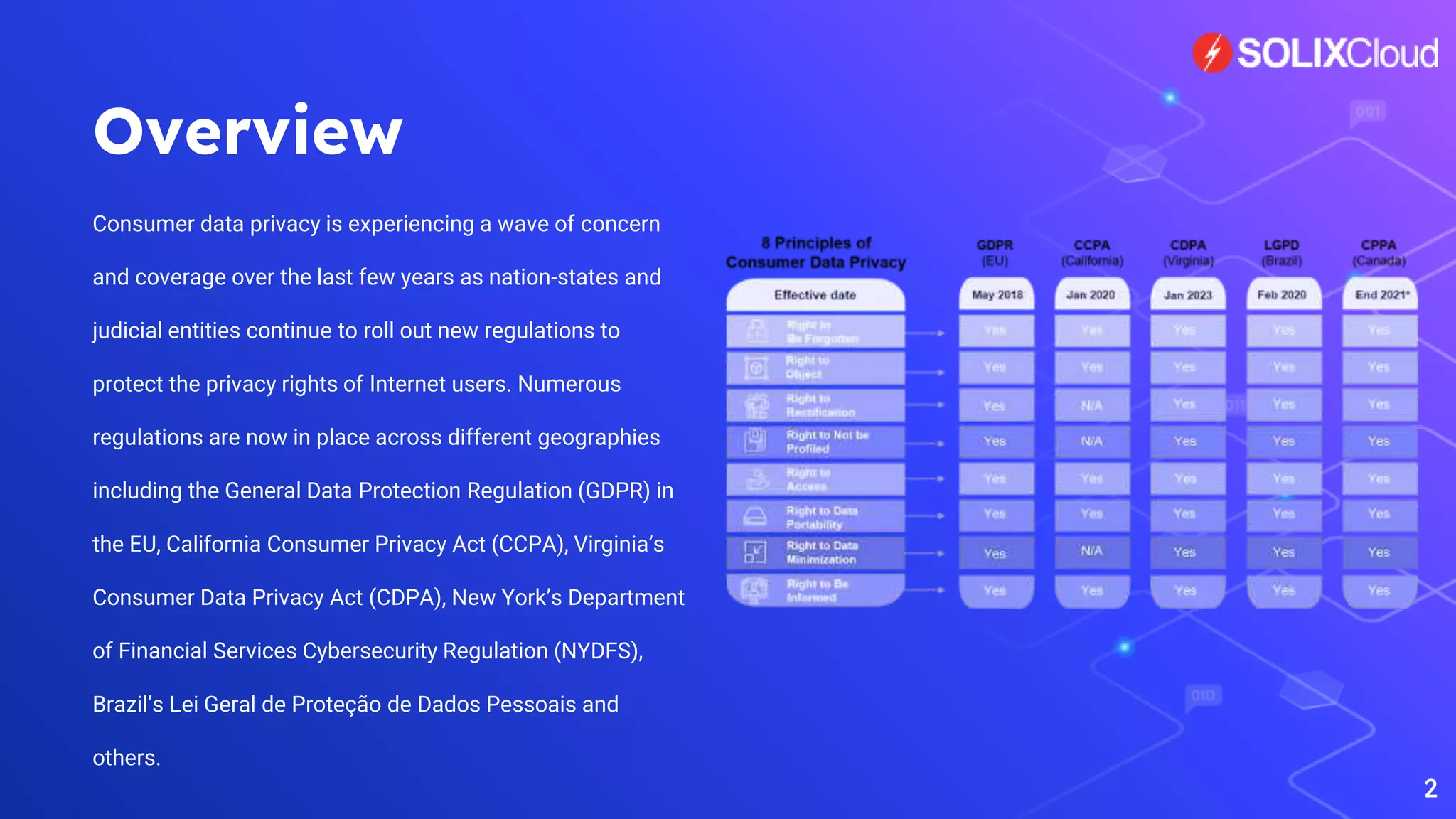 The document outlines eight principles of consumer data privacy, which address regulations across various regions including the GDPR and CCPA. It emphasizes the rights of consumers regarding their personal data, including the right to be forgotten, right to access, and right to data portability, among others, alongside the role of SolixCloud's data management solutions in achieving compliance. The document concludes with a note on the importance of a unified approach to data privacy that adheres to global regulations.
