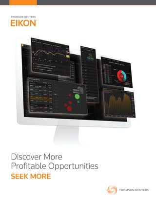Thomson Reuters Eikon is a financial software platform that allows users to discover profitable opportunities through access to news, data, analytics, markets and professional networks anywhere through an intuitive desktop and mobile experience. It provides intelligent search across multiple sources to identify opportunities across assets and globally. Eikon is designed to be more connected, informed, intelligent and open to give users more control over their information and integration with other sources and trading venues.