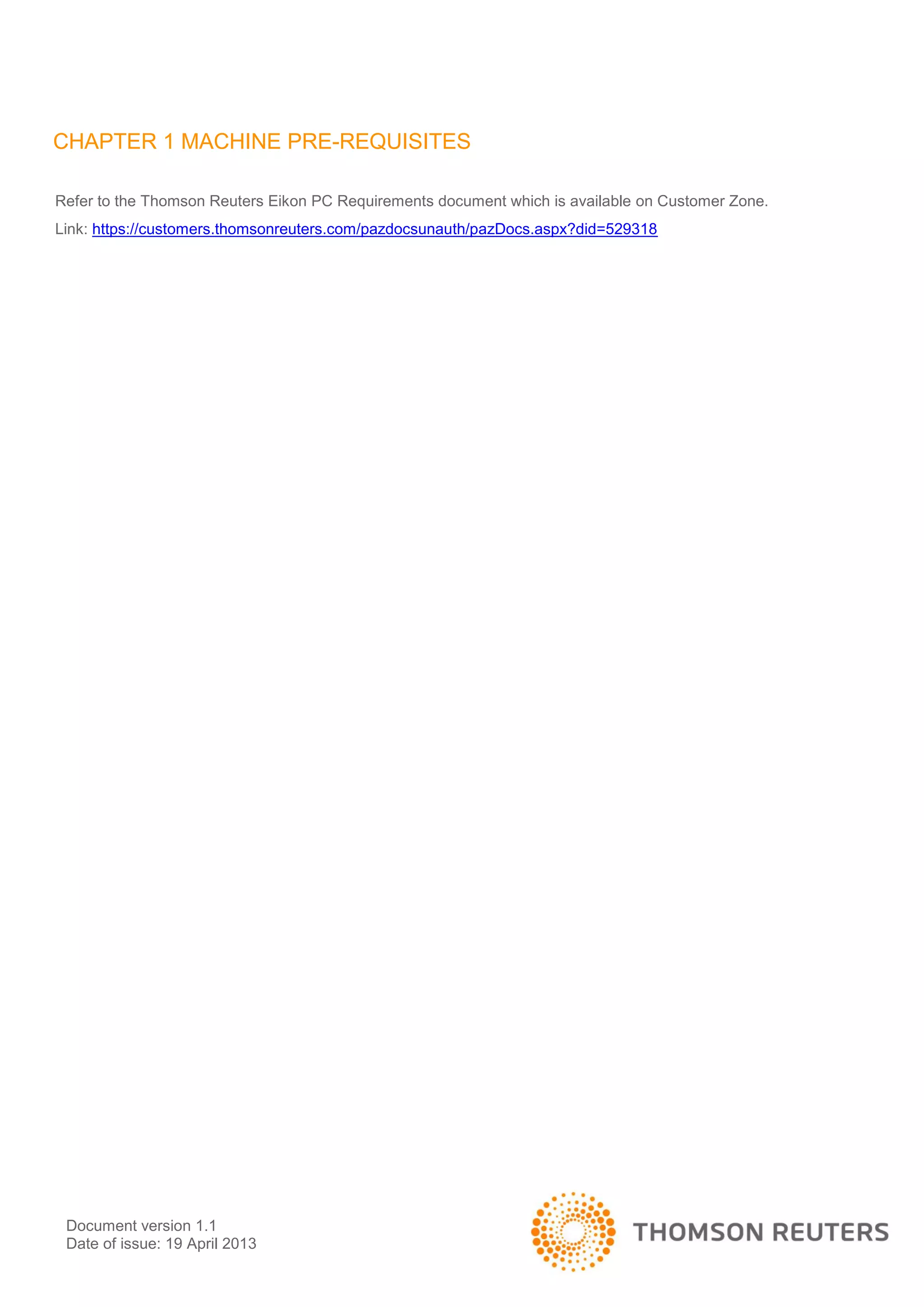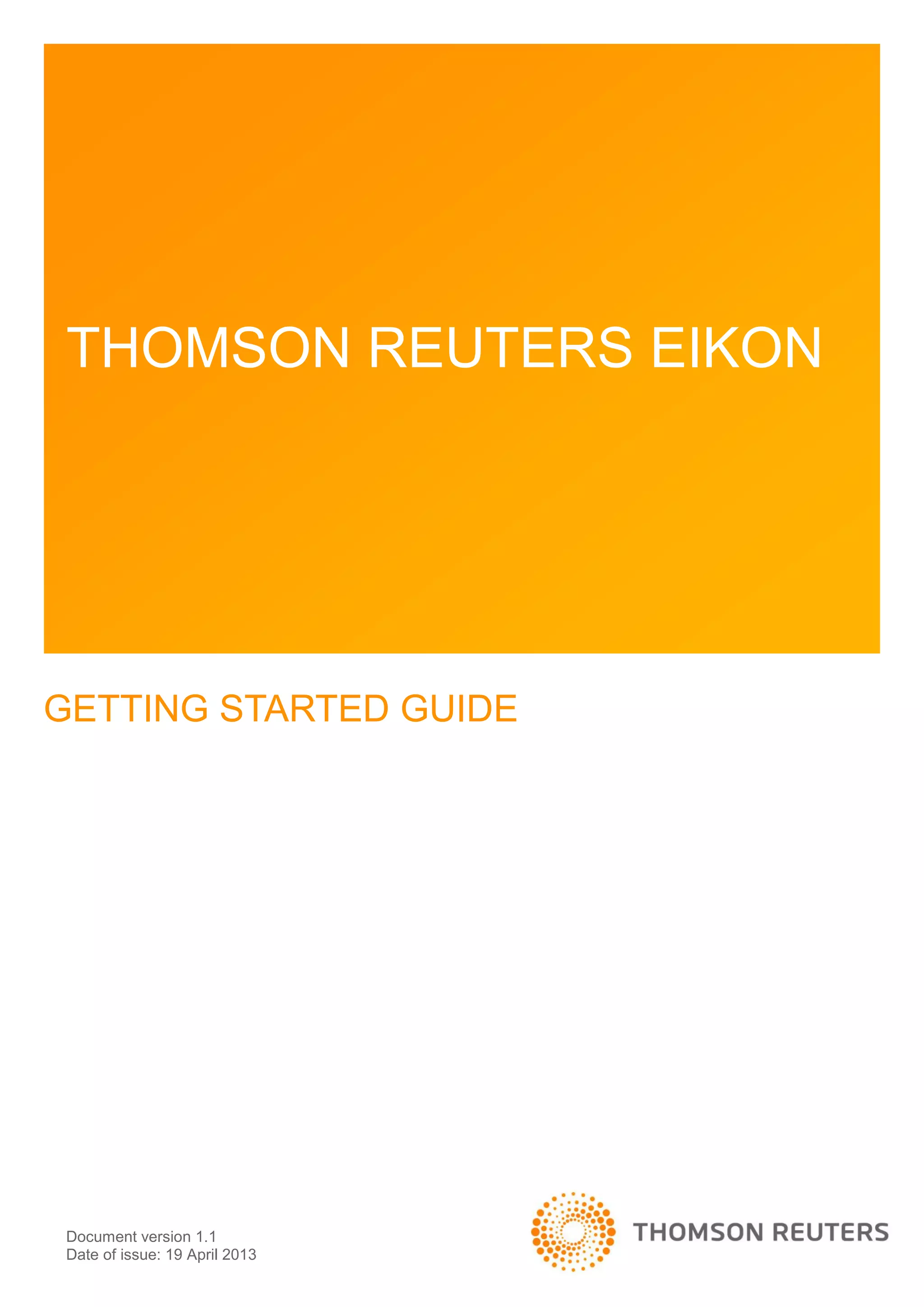 This document provides instructions for installing the Thomson Reuters Eikon software. It describes downloading the installation package from the Thomson Reuters website using a valid login credential. The installation process is then outlined in steps, which involves accepting a license agreement, choosing a location, downloading, and running the installation file. Upon completion, the Thomson Reuters Eikon desktop can be launched. Contact information is provided if any issues occur with the installation.