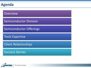- eInfochips provides semiconductor solutions including silicon design, verification, physical design, and board design. They have over 16 years of experience and 150+ tape-outs.