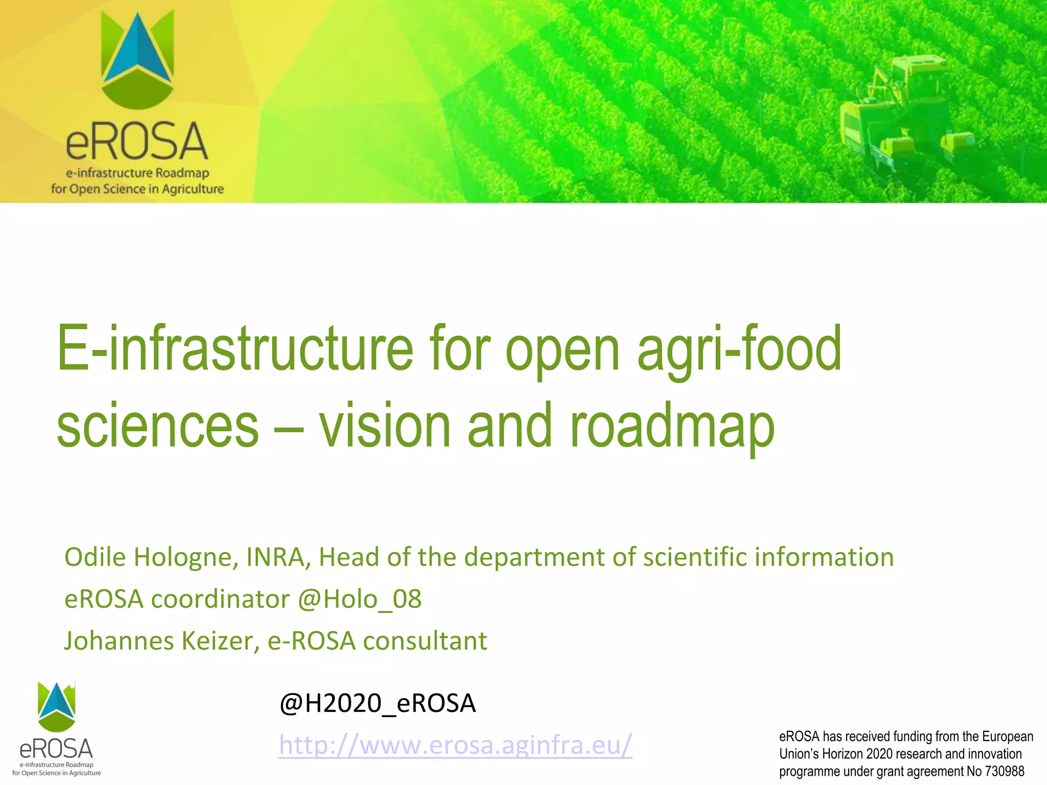 The e-rosa project, funded by the European Union's Horizon 2020 program, aims to enhance collaboration among stakeholders in the agri-food sciences and information and communication technology sectors. Key objectives include community building, knowledge improvement, and establishing a roadmap for an e-infrastructure that supports open science in agriculture. Through stakeholder workshops and data analysis, the project seeks to address challenges in data management and promote transparency and access in the agri-food sector.