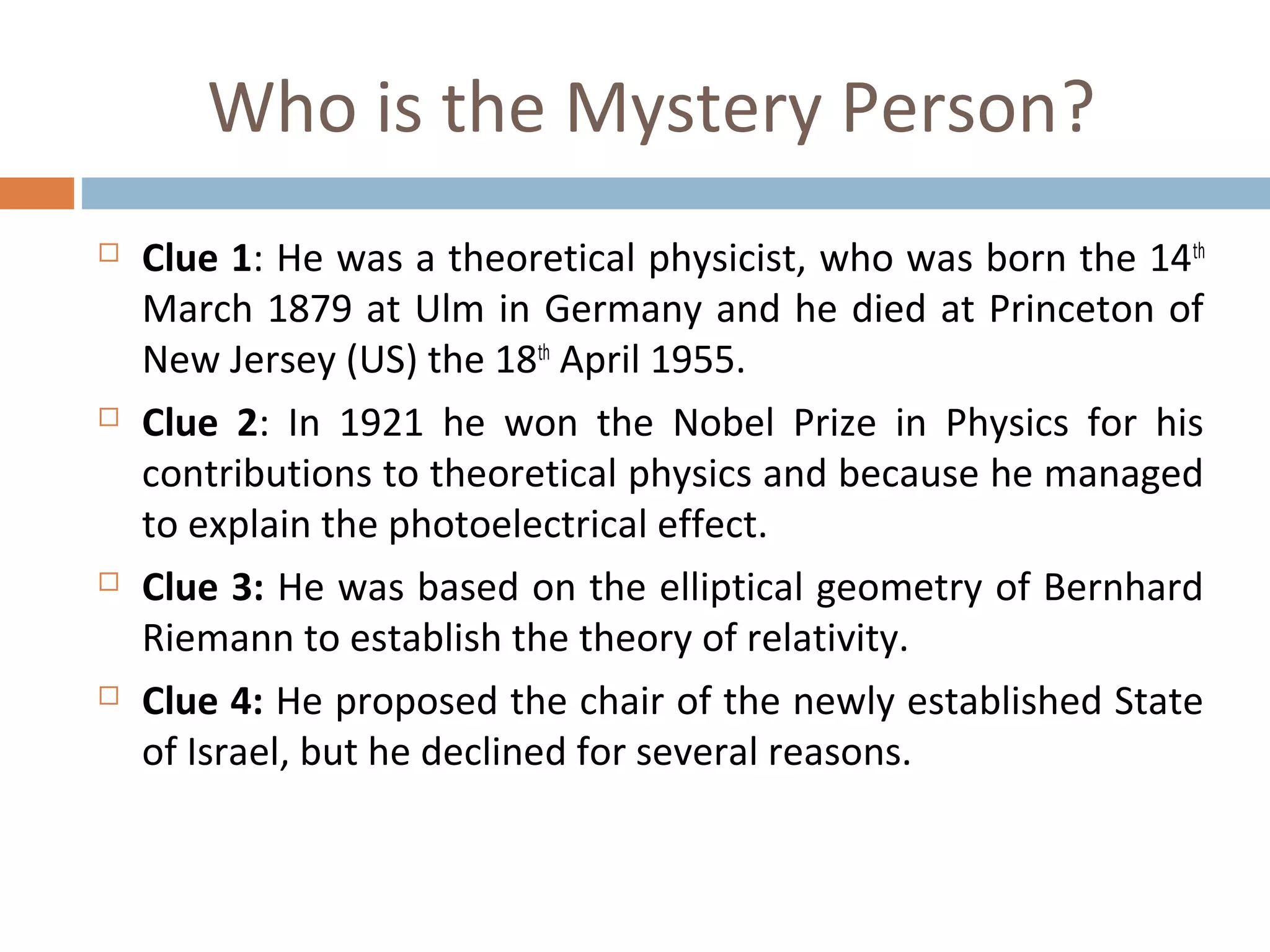 The mystery person is Albert Einstein, a theoretical physicist born in Germany in 1879 who won the Nobel Prize in Physics in 1921 for his contributions to theoretical physics, including explaining the photoelectric effect and establishing the theory of relativity based on Riemannian geometry. He later declined an offer to be the president of Israel and died in 1955 in Princeton, New Jersey.