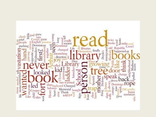 This document summarizes a presentation about building independent reading for students in upper elementary grades. It discusses the importance of reading for student development and engagement. It provides strategies for selecting books that interest students, creating a community of readers in the classroom, using read-alouds to foster reading skills, and allowing student choice and agency in selecting books. The presentation emphasizes selecting books across genres and text levels to appeal to varied readers and making reading a enjoyable experience.