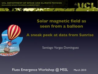 - The document summarizes data from the Sunrise balloon-borne solar observatory, which achieved high-resolution spectro-polarimetric observations of the solar atmosphere using instruments like IMaX and SUFI.