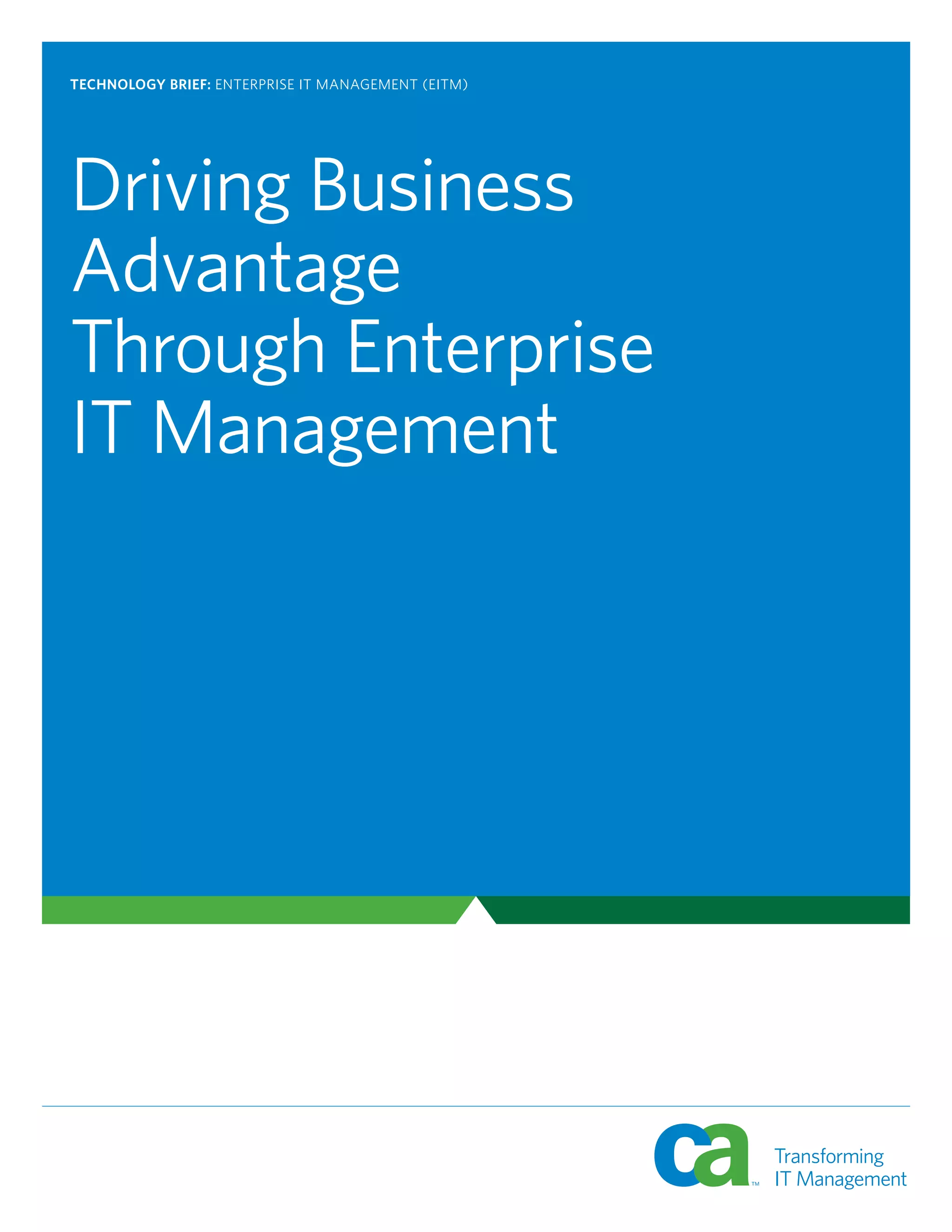 The document discusses the necessity of Enterprise IT Management (EITM) for organizations to unify and simplify IT processes, enabling agility and alignment with business strategies. It highlights the complexities in current IT operations, where disconnected systems impede growth, while promoting EITM as a solution through CA's modular capability solutions that enhance visibility, risk management, and service delivery. Ultimately, EITM is positioned as essential for organizations to leverage IT effectively for competitive advantage and operational efficiency.