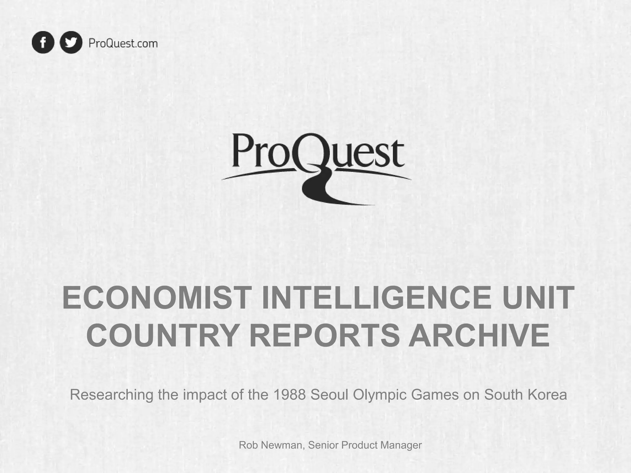 The document discusses using the Economist Intelligence Unit Country Reports Archive to examine the impact of South Korea hosting the 1988 Seoul Olympics. The reports provide analysis of the political and economic developments in South Korea from the awarding of the Olympics in 1981 through the successful hosting of the Games in 1988. The Olympics benefited South Korea economically and politically, improving relations with China, and likely contributed to South Korea's transition to a more democratic system.