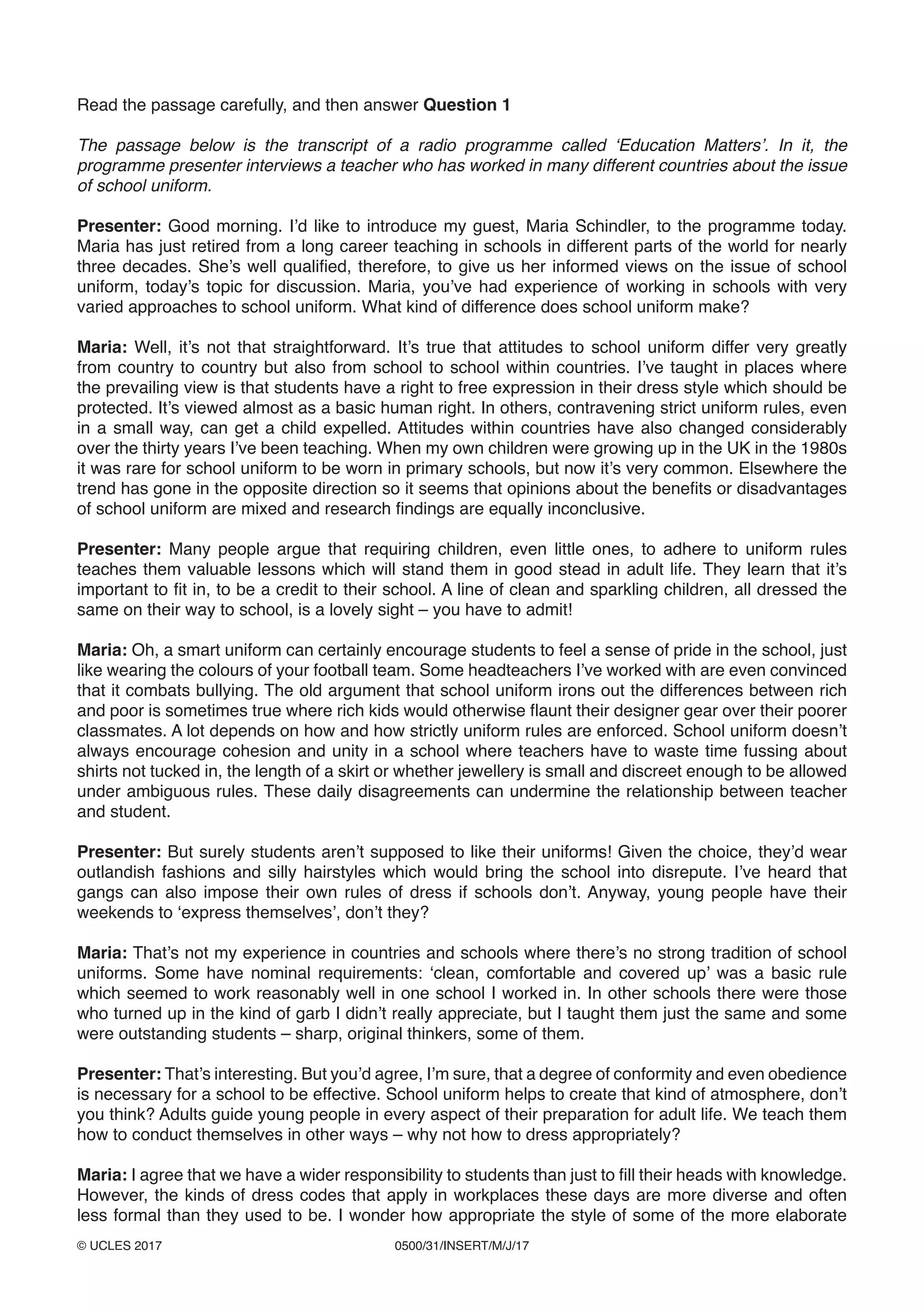 1. Maria has experience teaching for nearly 30 years in schools around the world with varying approaches to school uniform. Attitudes towards school uniforms differ greatly between countries and schools.
