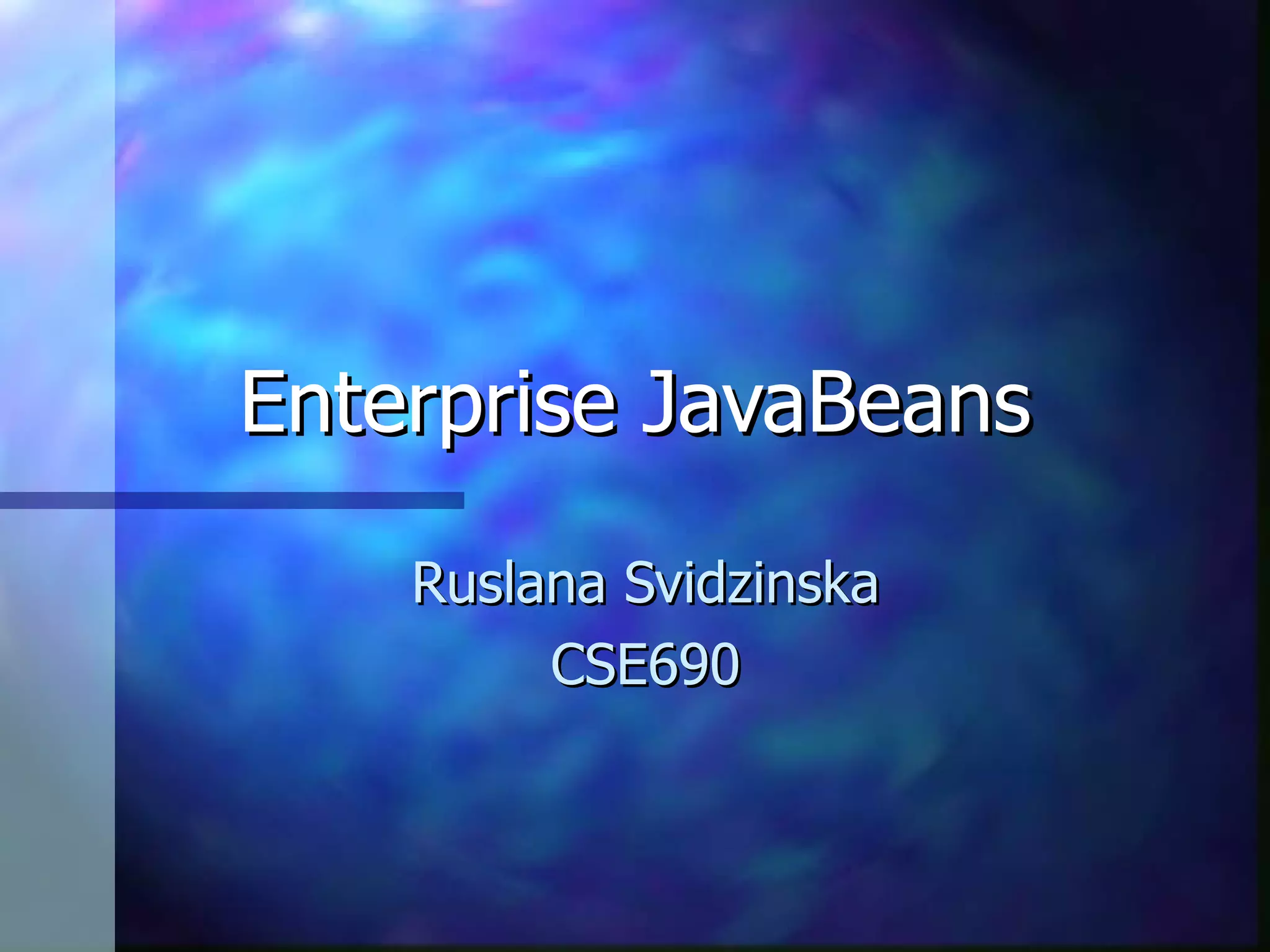 Enterprise JavaBeans (EJB) are server-side components that allow developers to write business logic independently of underlying middleware services like transactions and security. EJBs run within an EJB container managed by an application server, which handles these services automatically. The EJB specification defines standards for container functionality, component model, and interfaces to support portability of EJBs across application servers.