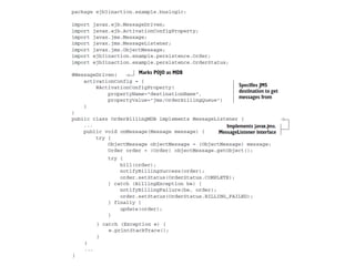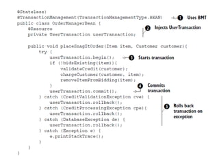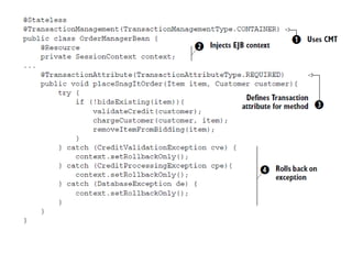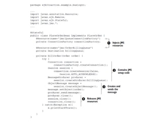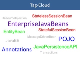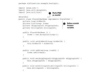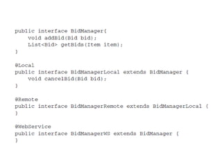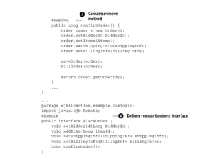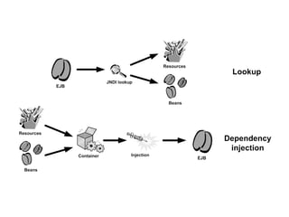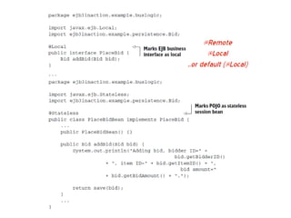 The document introduces Enterprise Java Beans (EJB) 3.0, highlighting its role in building scalable business applications while simplifying infrastructure concerns like transactions and security. It compares EJB 3.0 to earlier versions, emphasizing its use of POJOs and annotations over complex XML configurations, along with improvements in performance and usability. Additionally, it outlines the types and functionalities of EJB components, focusing on session beans and the Java Persistence API.