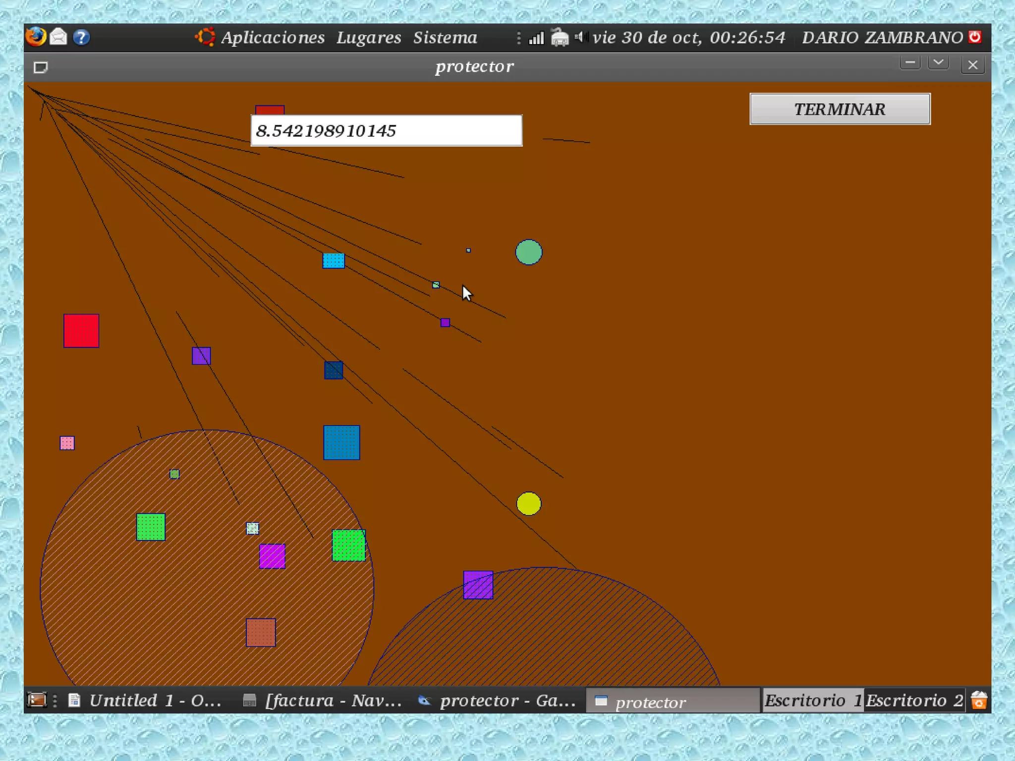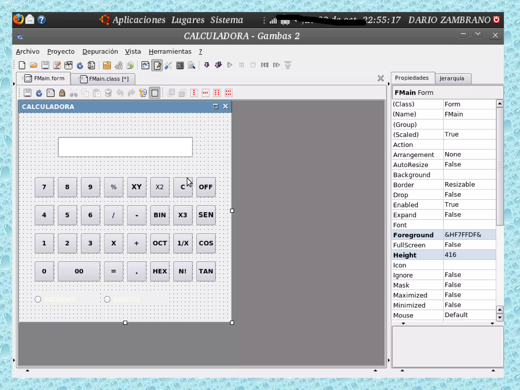 The document contains code for a calculator application written in Gambas. It defines various button click events that update the text in a text box with numbers or perform calculations. Functions are included to convert numbers to words, perform mathematical operations, and convert between number bases.