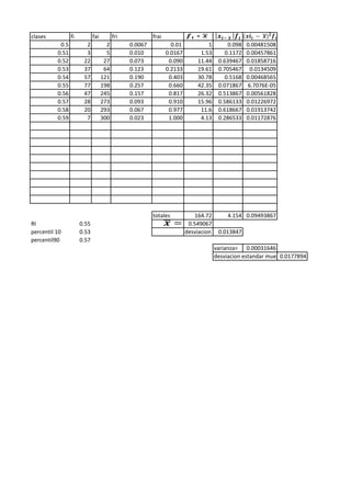 fri frai 0.5 2 2 0.0067 0.01 1 0.098 0.00481508 0.51 3 5 0.010 0.0167 1.53 0.1172 0.00457861 0.52 22 27 0.073 0.090 11.44 0.639467 0.01858716 0.53 37 64 0.123 0.2133 19.61 0.705467 0.0134509 0.54 57 121 0.190 0.403 30.78 0.5168 0.00468565 0.55 77 198 0.257 0.660 42.35 0.071867 6.7076E-05 0.56 47 245 0.157 0.817 26.32 0.513867 0.00561828 0.57 28 273 0.093 0.910 15.96 0.586133 0.01226972 0.58 20 293 0.067 0.977 11.6 0.618667 0.01913742 0.59 7 300 0.023 1.000 4.13 0.286533 0.01172876 totales 164.72 4.154 0.09493867 RI 0.55 0.549067 percentil 10 0.53 desviacion media=0.013847 percentil90 0.57 varianza= 0.00031646 desviacion estandar muestral=0.0177894