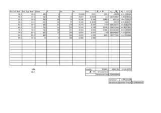 This document contains statistical data including minimum and maximum values, ranges, class intervals, frequencies, and measures of central tendency and dispersion. The data relates to a sample of 133 total observations with a minimum value of 39, maximum of 89, and range of 43. Measures calculated include the mean of 66.5, median of 45, variance of 73.94, and standard deviation of 8.59. Frequency distributions and histograms are presented to illustrate the data distribution.