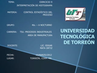 This document contains data from an experiment measuring 25 samples over 20 intervals. It includes the raw data, calculations of statistical measures like the mean, standard deviation, and variance. It also contains the data needed to plot a histogram, showing the frequency distribution of the sample values. The histogram indicates that most values fall within 3 standard deviations of the mean of 2.8, but there is an outlier between 2.65-2.7 that is outside specifications.