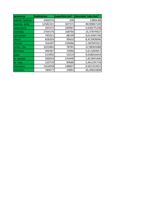 km² dencidad hab./km² capital federal 2960976 200 14804,88 buenos aires 12582321 307571 40,90867149 catamarca 265571 100967 2,630275238 cordoba 2764176 168766 16,37874927 corrientes 795021 88199 9,013945736 chaco 838303 99633 8,413909046 chubut 356587 224686 1,587045922 entre rios 1022865 78781 12,98365088 formosa 404367 72066 5,611064857 jujuy 513992 53219 9,658054454 la pampa 260034 143440 1,812841606 la rioja 220729 89680 2,461295718 mendoza 1414058 148827 9,501353921 misiones 789677 29801 26,49833898