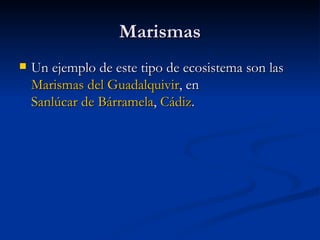Este documento contiene información sobre diferentes ecosistemas acuáticos como marismas, albuferas y lagunas. También describe las características de las playas de arena negra en las islas Canarias y explica brevemente las mareas en el océano Atlántico, el mar Mediterráneo y el mar Cantábrico.