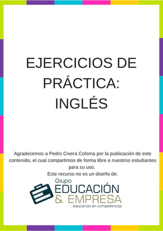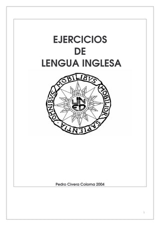 This document provides a summary of exercises for practicing English grammar and vocabulary. It contains over 20 sections covering topics like spelling, personal information, verbs like to be, to have, and to do, days, hours, dates and numbers, nationalities, quantities, routines, pronouns, possessives, articles, plurals, verb tenses, conditionals, passive voice, reported speech, gerunds, and irregular verbs. The document is a compilation of exercises for students to practice and reinforce their English skills. It was created by Pedro Civera Coloma in 2004 to share freely with students.