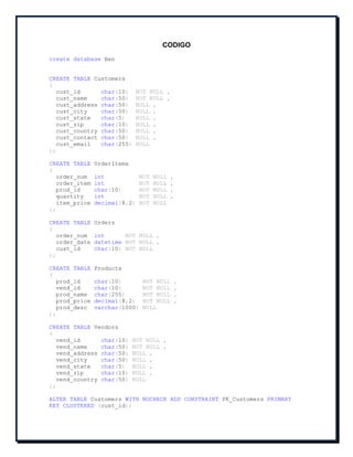 The document describes the creation of a database called "Ben" with tables for customers, order items, orders, products, and vendors. It includes code to define the tables, relationships, and primary/foreign keys. Sample data is then inserted into each table to populate the database.
