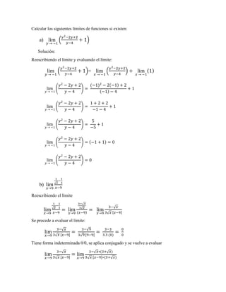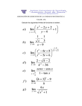 Ejercicios de limites 1. ASIGNACIÒN DE EJERCICIOS DE LA UNIDAD II MATEMATICA I.