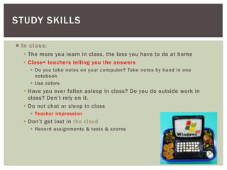 This document provides tips for 9th grade students on study skills, organization, and time management. It recommends taking handwritten notes in class, highlighting important information, using a to-do list and calendar such as iCal to stay organized, and managing flex time to either work or relax. The document stresses the importance of time management to avoid procrastination and maintain a healthy work-life balance.