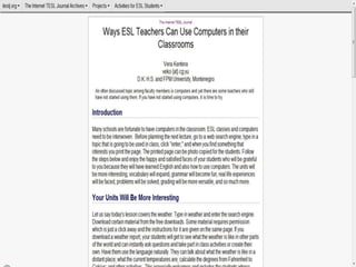 The document discusses using TESL (Teaching English as a Second Language) methods in the classroom. It states that using TESL approaches will make lessons more engaging for students, expand their vocabulary, and help grammar become more enjoyable. Students will also learn to adapt to real-life situations, and assessment will become more varied and accessible.