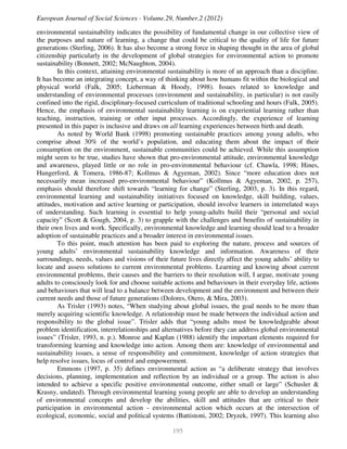 3. Knowledge of environmental issues, responsibility, action strategies, and empowerment are important for transforming learning into action according to some researchers. The paper will explore how young adults' environmental knowledge relates to their pro-environmental behaviors.