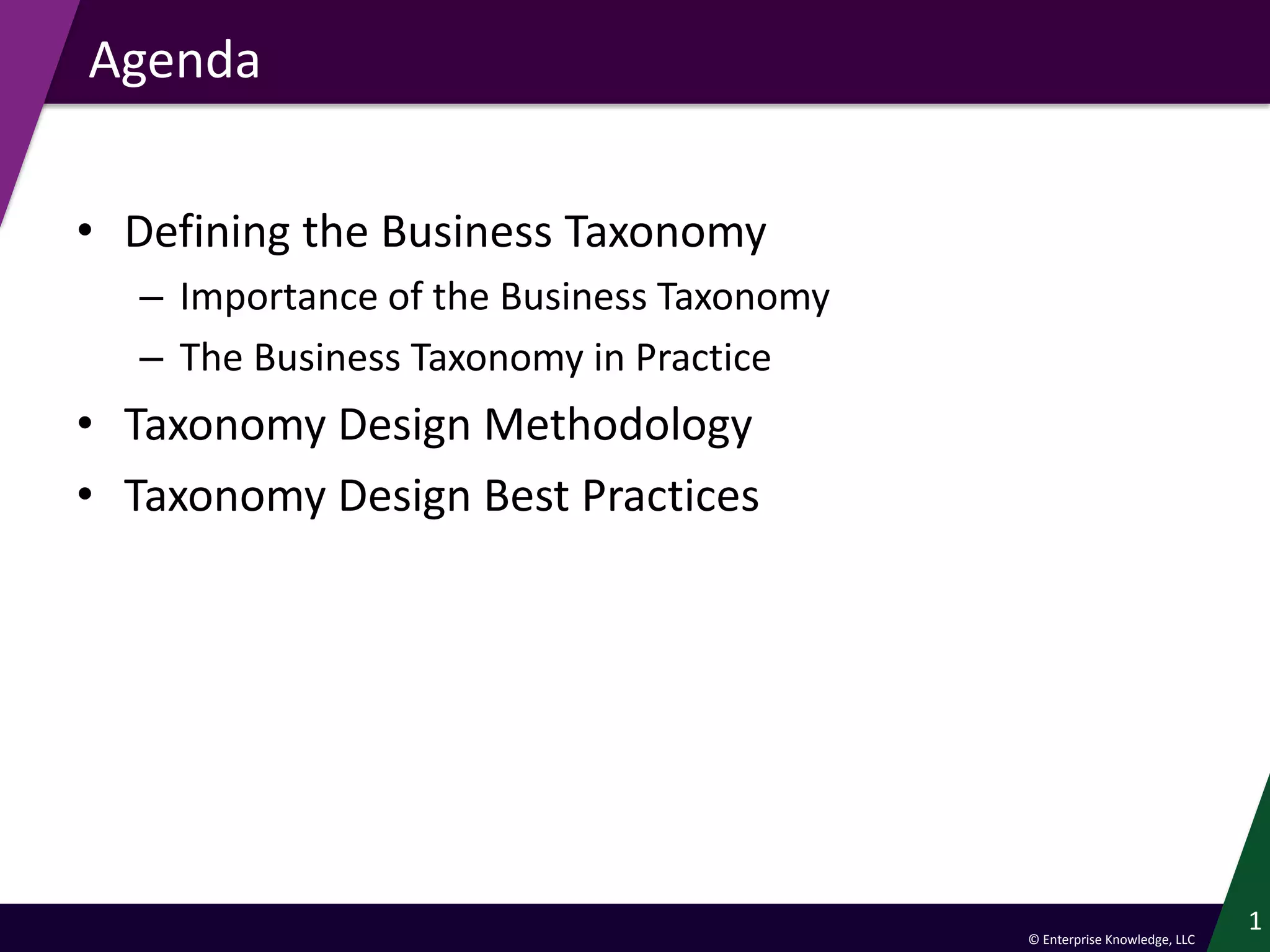 The document outlines the importance and methodology of designing business taxonomies for improved information management and findability within organizations. It contrasts traditional taxonomies with business taxonomies by emphasizing their usability, intuitiveness, and relevance to user needs. Additionally, it provides best practices for taxonomy design, including collaborative processes and iterative maintenance to ensure effective implementation and longevity.