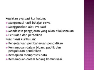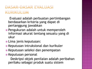 Buku ini membahas tentang evaluasi kurikulum meliputi dasar-dasar, pendekatan, strategi, mutu, kelayakan, pengembangan kurikulum. Buku ini berguna sebagai pedoman bagi calon guru dalam merancang, mengembangkan, dan mengevaluasi kurikulum secara sistematis dan terukur.